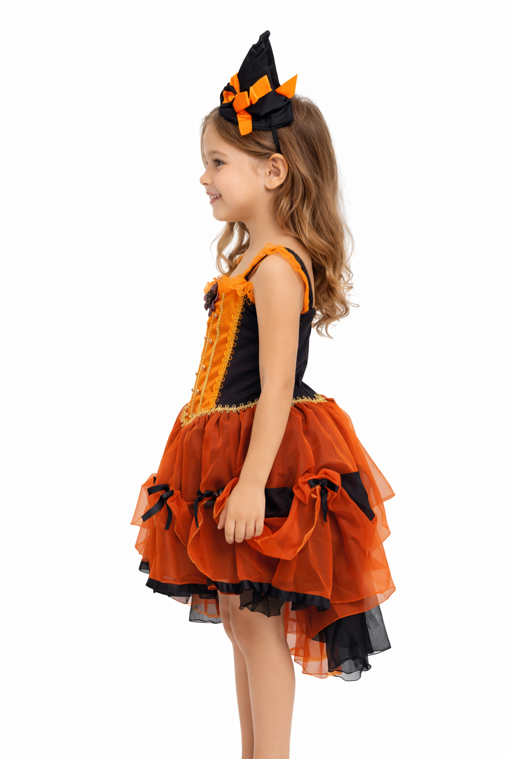 🎃 Fantasiade Bruxinha Laranjinha Kids – Luxo e Encanto Transforme o Halloween ou a festa à fantasia em um momento mágico com a nossa Fantasia de Bruxinha Laranjinha! Com um design vibrante e cheio de detalhes, essa peça une o mistério das bruxas com a alegria da cor laranja, garantindo que sua pequena seja o destaque de qualquer celebração. 🧙♀️✨ ✨ Por que escolher esta fantasia? Design Exclusivo: Corpete estruturado em tons de laranja e preto, com detalhes dourados e um delicado adorno floral no centro. Saia Volumosa: Estilo tutu com múltiplas camadas de tule e cetim, decorada com laços pretos charmosos que dão um movimento incrível. 👗 Conforto em Primeiro Lugar: Tecido leve e respirável, ideal para a criança brincar, pular e se divertir sem incômodos. Acessório Incluso: Acompanha uma mini cartola/chapéu de bruxa combinando, fixada em uma tiara confortável. 🎩🧡 📏 Venha ser a Bruxinha mais linda, com Magnifica Fantasias